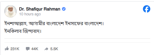 রোববার ভোর ৬টা নাগাদ নিজের ভেরিফায়েড ফেসবুক পেজে ডা. শফিকুর রহমান একই সুরে একটি স্ট্যাটাস দিয়েছেন। তিনিও লিখেছেন ‘ইনকিলাব জিন্দাবাদ’। পোস্ট দেওয়ার পর পরই দ্রুত ছড়িয়ে পড়ে।