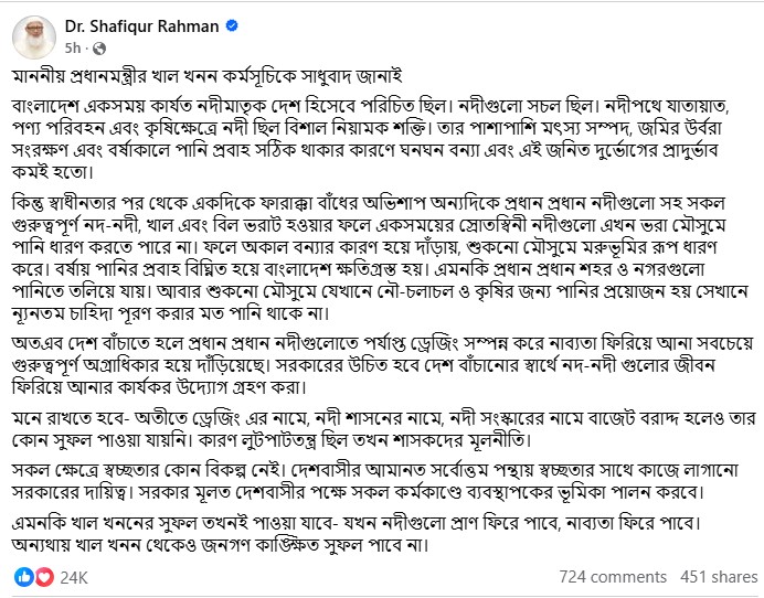 ডা. শফিকুর রহমান তার পোস্টে অতীতে ড্রেজিং, নদীশাসন ও নদী সংস্কারের নামে বাজেট বরাদ্দ হলেও অনেক ক্ষেত্রে কাঙ্ক্ষিত সুফল পাওয়া যায়নি বলেও উল্লেখ করেন। তিনি বলেন, স্বচ্ছতা নিশ্চিত করা ছাড়া উন্নয়ন কার্যক্রমের সফলতা সম্ভব নয়। দেশবাসীর আমানত স্বচ্ছতার সঙ্গে কাজে লাগানো সরকারের দায়িত্ব।