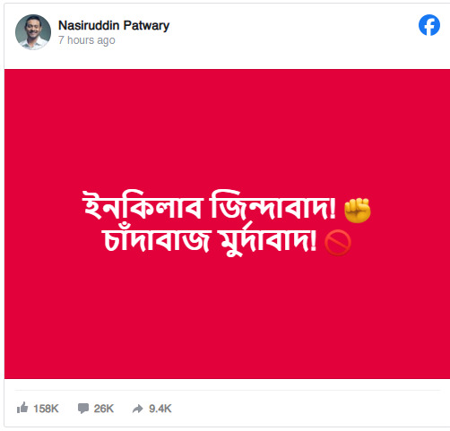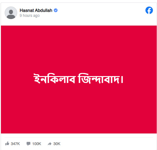 নবনির্বাচিত সংসদ সদস্য ও এনসিপির মুখ্য সংগঠক হাসনাত আব্দুল্লাহ স্ট্যাটাসে তিনি লেখেন, ‘ইনকিলাব জিন্দাবাদ।’