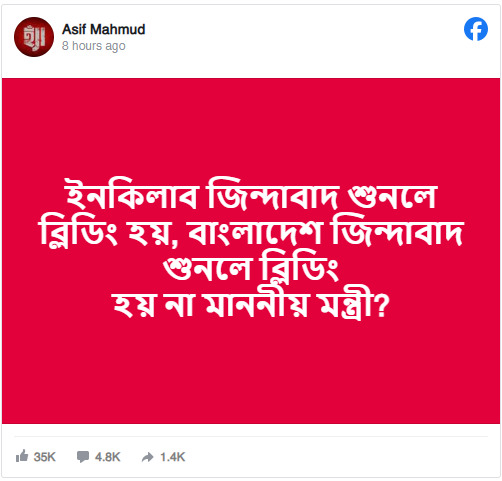 এরপর আসিফ মাহমুদ তার ফেসবুক আইডিতে দেওয়া স্ট্যাটাসে লিখেন, ‘ইনকিলাব জিন্দাবাদ শুনলে ব্লিডিং হয়, বাংলাদেশ জিন্দাবাদ শুনলে ব্লিডিং হয় না মাননীয় মন্ত্রী?’