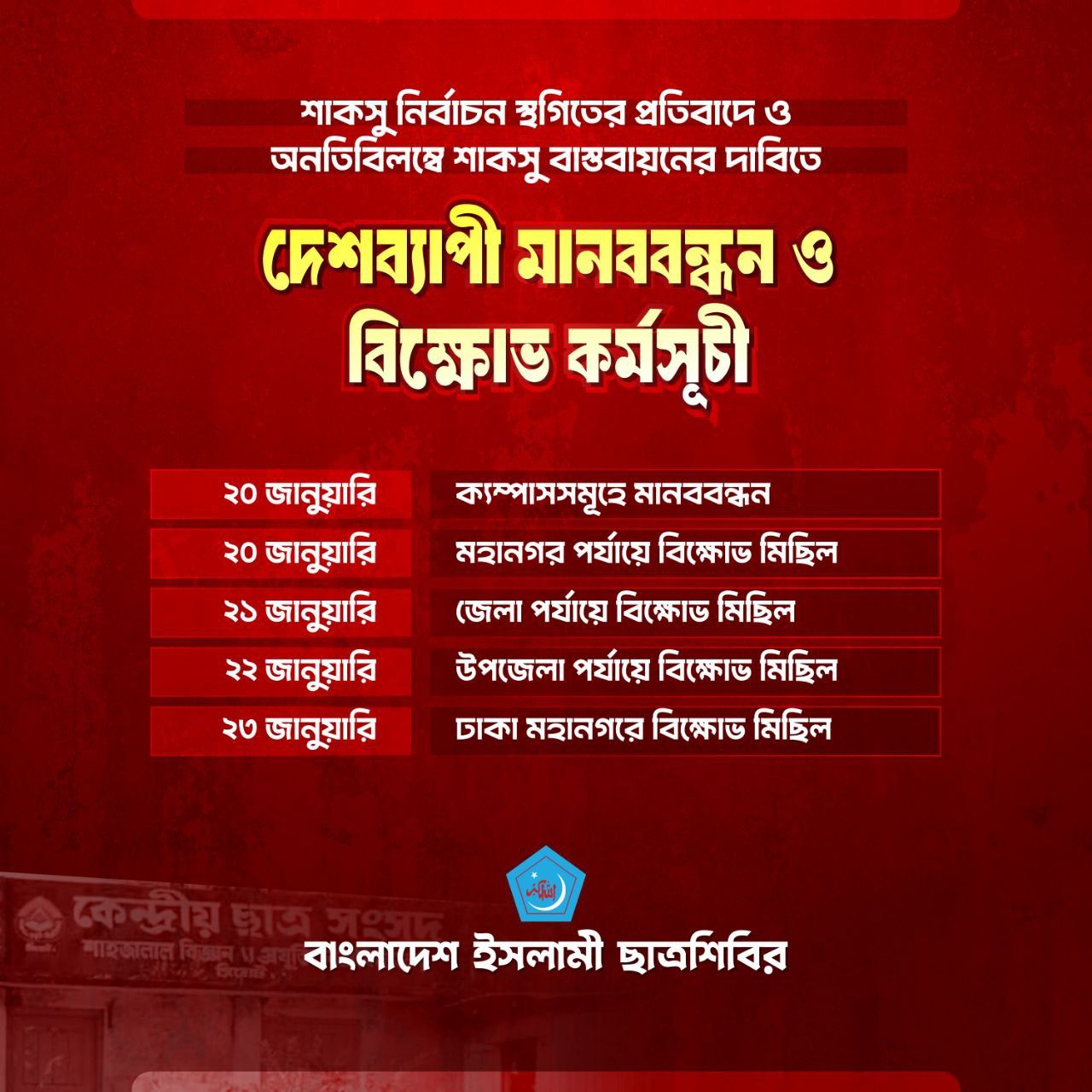 দেশব্যাপী মানববন্ধন ও বিক্ষোভ কর্মসূচী ঘোষনা: ছাত্রশিবিরের